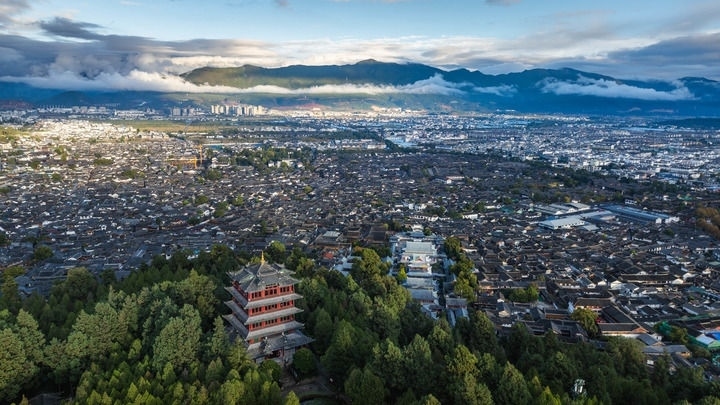 2024年11月8日,麗江古城日落風(fēng)光(無人機(jī)照片)。新華社記者 胡超 攝