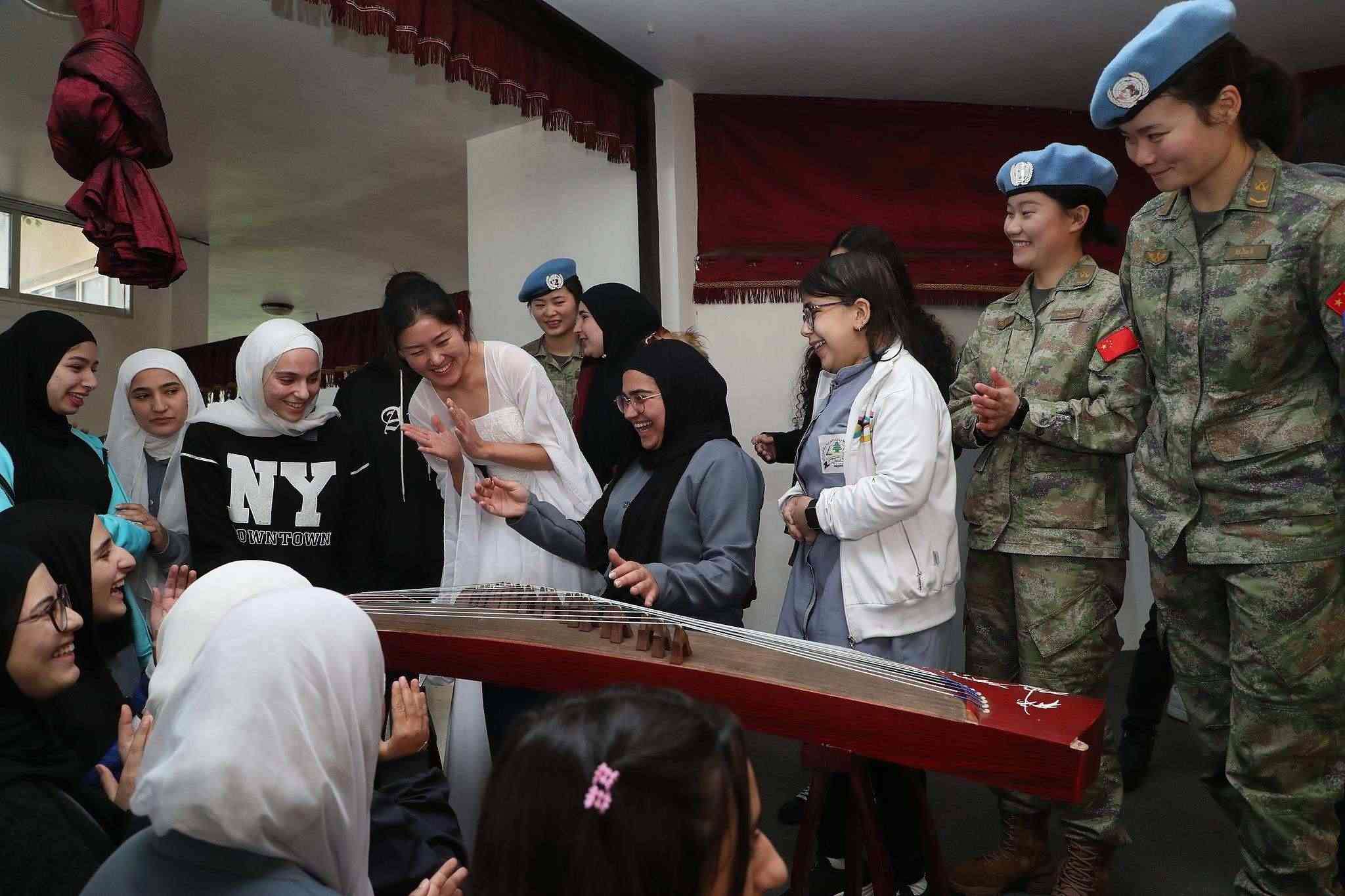 △2024年3月12日,中國第22批赴黎維和部隊(duì)官兵與黎巴嫩庫雷拉中學(xué)開展文化交流活動。