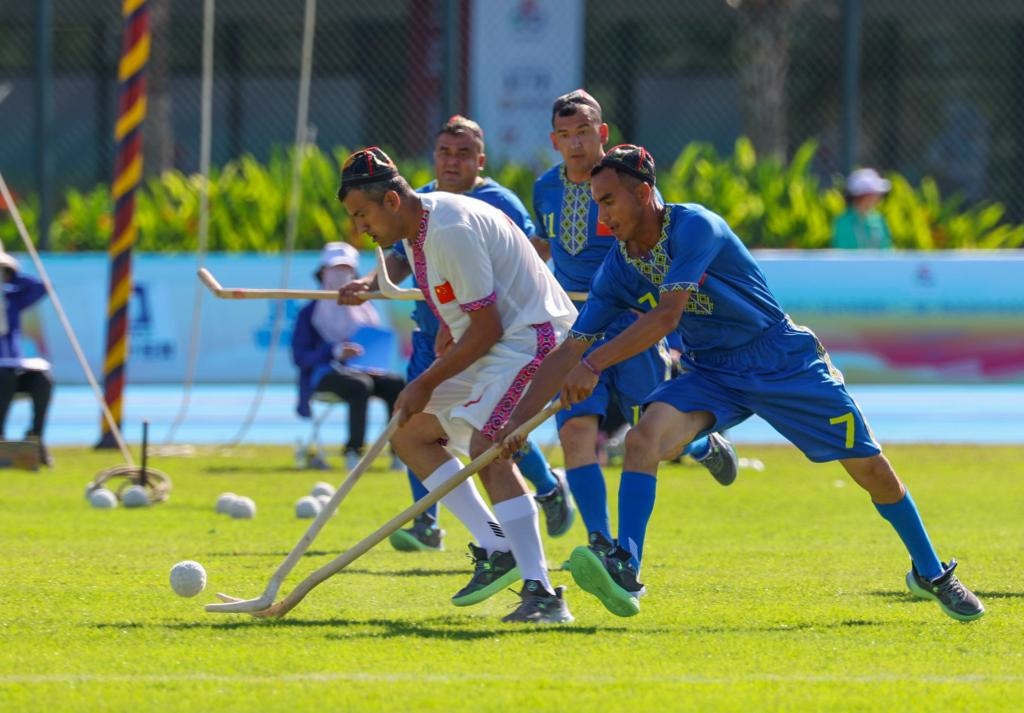 ??山海難擋情意濃。在24日的表演項目里,10多名來自新疆和田地區(qū)于田縣各行各業(yè)的隊員帶來了麥熱球表演。山高路遠,他們歷時三天才抵達三亞?!拔覀兿胂蛉珖嗣裾故钧湡崆蜻@項運動,在場外和大家多交流,讓各族人民了解南疆的發(fā)展變化。”隊長吾買爾江說。