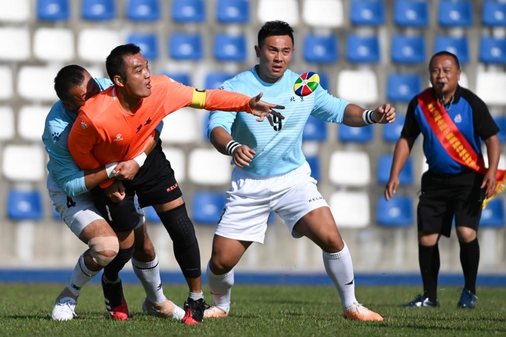 ??11月24日,在三亞市體育中心舉行的第十二屆全國少數民族傳統體育運動會室外表演項目中,新疆隊球員阿卜杜拉艾孜則·阿卜杜海娃爾(前右)在麥熱球表演中。新華社記者 陳朔 攝