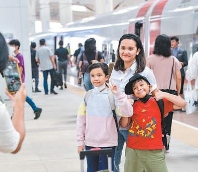 硬聯(lián)通雅萬高鐵是我國在境外完成全過程勘察設(shè)計(jì)建設(shè)的首個高鐵項(xiàng)目,于去年10月17日正式開通運(yùn)營,是中印尼共建“一帶一路”合作的典范。圖為乘客在和雅萬高鐵動車組合影留念。新華社記者 徐 欽攝