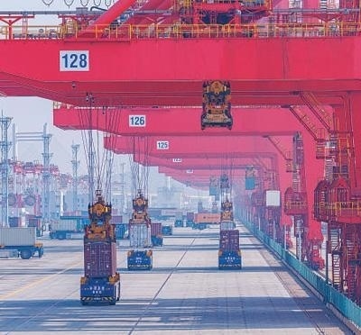 軟聯(lián)通共建“一帶一路”國家在工作制度對接、技術(shù)標(biāo)準(zhǔn)協(xié)調(diào)、檢驗(yàn)結(jié)果互認(rèn)等方面強(qiáng)化合作、統(tǒng)一標(biāo)準(zhǔn),貿(mào)易自由化便利化水平不斷提升。上海洋山港海關(guān)對接共建國家進(jìn)出口貨物相關(guān)標(biāo)準(zhǔn),推動通關(guān)一體化方式申報(bào),提升通關(guān)效率。圖為無人駕駛的全自動導(dǎo)引車在洋山港穿梭往來,搬運(yùn)集裝箱。王 初攝(影像中國)