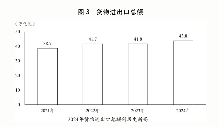(六)加快建設(shè)更高水平開放型經(jīng)濟(jì)新體制,高水平對(duì)外開放取得積極成效。全年貨物進(jìn)出口總額43.8萬億元,服務(wù)進(jìn)出口總額7.5萬億元,外商直接投資1162億美元,境外直接投資1438億美元。年末外匯儲(chǔ)備規(guī)模達(dá)32024億美元。