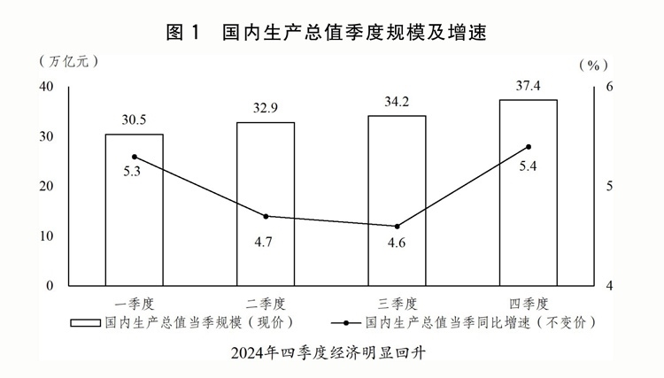 (一)因時(shí)因勢(shì)加強(qiáng)和創(chuàng)新宏觀調(diào)控,推動(dòng)經(jīng)濟(jì)回升向好。扎實(shí)開展宏觀政策逆周期調(diào)節(jié),加大政策力度,釋放政策效能,特別是9月26日中央政治局會(huì)議果斷部署一攬子增量政策,市場(chǎng)預(yù)期、社會(huì)信心有效提振,四季度經(jīng)濟(jì)明顯回升。全年國(guó)內(nèi)生產(chǎn)總值(GDP)134.9萬億元、增長(zhǎng)5%,其中,一、二、三產(chǎn)業(yè)分別增長(zhǎng)3.5%、5.3%、5%。