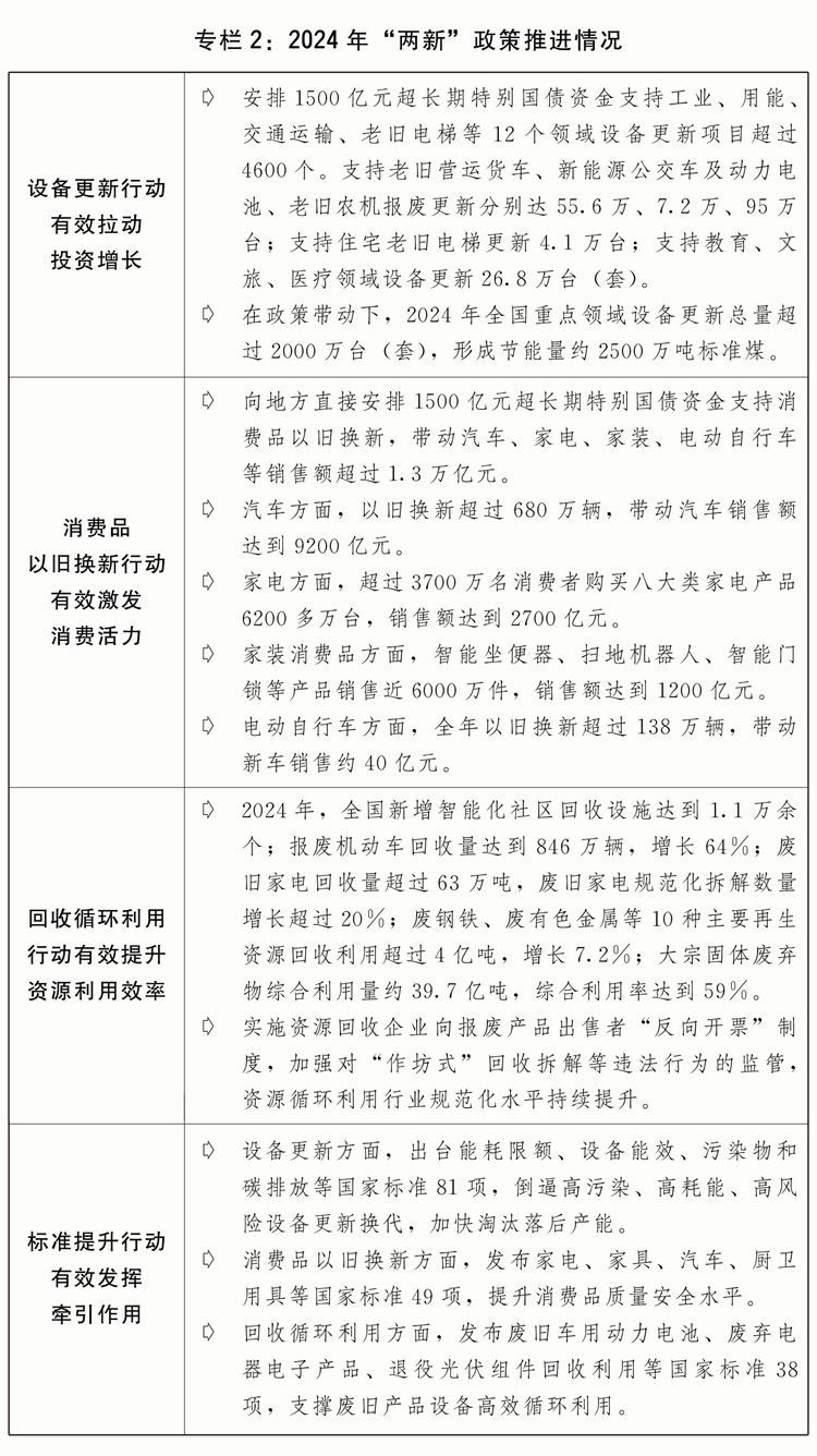 三是大規(guī)模設(shè)備更新和消費(fèi)品以舊換新政策落地見效。印發(fā)“兩新”行動(dòng)方案,出臺(tái)工業(yè)、建筑市政、交通、農(nóng)業(yè)、教育、文旅、醫(yī)療等七大領(lǐng)域設(shè)備更新實(shí)施方案和消費(fèi)品以舊換新、回收循環(huán)利用、標(biāo)準(zhǔn)提升引領(lǐng)行動(dòng)方案。安排3000億元超長(zhǎng)期特別國(guó)債加力支持“兩新”工作。2024年,“兩新”政策帶動(dòng)全國(guó)設(shè)備工器具購(gòu)置投資增長(zhǎng)15.7%,高于固定資產(chǎn)投資(不含農(nóng)戶)增速12.5個(gè)百分點(diǎn);限額以上單位家用電器和音像器材類、家具類商品零售額分別增長(zhǎng)12.3%、3.6%,帶動(dòng)大宗耐用消費(fèi)品銷售額超過1.3萬億元;消費(fèi)品以舊換新活動(dòng)中,新能源汽車銷量占比超過60%,一級(jí)能效家電銷售額占比超過90%。