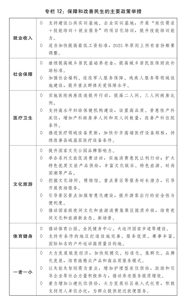 一是實(shí)施提振消費(fèi)專項(xiàng)行動(dòng)。制定提升消費(fèi)能力、增加優(yōu)質(zhì)供給、改善消費(fèi)環(huán)境政策舉措,穩(wěn)定大宗消費(fèi)、擴(kuò)大服務(wù)消費(fèi)、拓展新型消費(fèi)、合理增加公共消費(fèi),推動(dòng)消費(fèi)提質(zhì)升級(jí)。多渠道促進(jìn)居民增收,推動(dòng)中低收入群體增收減負(fù),完善勞動(dòng)者工資正常增長(zhǎng)機(jī)制。因城施策調(diào)減房地產(chǎn)消費(fèi)限制性措施,推動(dòng)建設(shè)安全、舒適、綠色、智慧的“好房子”,更好滿足人民群眾剛性和改善性住房需求、高品質(zhì)居住需要。進(jìn)一步優(yōu)化汽車限購(gòu)管理政策,加快構(gòu)建充電基礎(chǔ)設(shè)施體系,開展汽車流通消費(fèi)改革試點(diǎn)。加快拓展文化、旅游、體育、健康、養(yǎng)老、托幼、家政、數(shù)字等服務(wù)消費(fèi),實(shí)施服務(wù)消費(fèi)提質(zhì)惠民活動(dòng)、“百城百區(qū)”文化和旅游消費(fèi)行動(dòng)計(jì)劃。加快培育帶動(dòng)性廣、顯示度高的消費(fèi)新場(chǎng)景,支持影視游戲創(chuàng)作與中華優(yōu)秀傳統(tǒng)文化、特色旅游資源相結(jié)合等融合式沉浸式消費(fèi)新場(chǎng)景發(fā)展。積極發(fā)展首發(fā)經(jīng)濟(jì)、冰雪經(jīng)濟(jì)、銀發(fā)經(jīng)濟(jì)。完善游艇、房車露營(yíng)等新型消費(fèi)領(lǐng)域管理機(jī)制和行業(yè)標(biāo)準(zhǔn),促進(jìn)“人工智能+消費(fèi)”,優(yōu)化消費(fèi)新業(yè)態(tài)新領(lǐng)域市場(chǎng)準(zhǔn)入環(huán)境,加快推動(dòng)各類新技術(shù)應(yīng)用推廣并向消費(fèi)級(jí)產(chǎn)品轉(zhuǎn)化。清理對(duì)消費(fèi)的不合理限制。深入實(shí)施優(yōu)化消費(fèi)環(huán)境三年行動(dòng),加強(qiáng)消費(fèi)信用體系和質(zhì)量標(biāo)準(zhǔn)體系建設(shè),規(guī)范網(wǎng)絡(luò)銷售、直播帶貨領(lǐng)域不合理經(jīng)營(yíng)行為,強(qiáng)化消費(fèi)者權(quán)益保護(hù)。落實(shí)和優(yōu)化帶薪年休假制度。完善外國(guó)人入境居留政策和免稅店政策,推動(dòng)擴(kuò)大入境消費(fèi)。深化國(guó)際消費(fèi)中心城市建設(shè)。