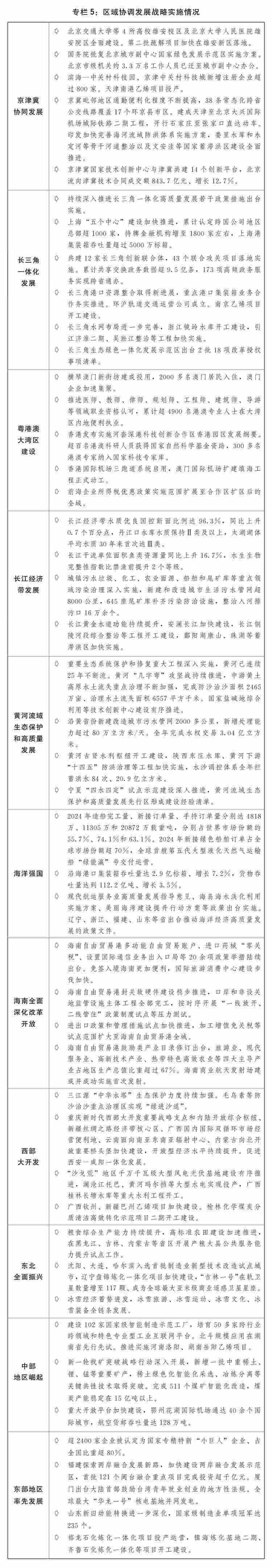一是區(qū)域協(xié)調(diào)發(fā)展積厚成勢(shì)。京津冀協(xié)同發(fā)展走深走實(shí),在京相關(guān)高校、醫(yī)院、中央企業(yè)總部及二三級(jí)子公司分批向雄安新區(qū)疏解,北京城市副中心行政辦公、商務(wù)服務(wù)、文化旅游等功能不斷完善,進(jìn)一步支持天津?yàn)I海新區(qū)高質(zhì)量發(fā)展若干政策措施出臺(tái)實(shí)施,三省市互聯(lián)互通交通網(wǎng)絡(luò)更加完善、產(chǎn)業(yè)鏈上下游協(xié)作持續(xù)強(qiáng)化、公共服務(wù)共建共享水平進(jìn)一步提升。長(zhǎng)三角一體化高質(zhì)量發(fā)展深入推進(jìn),生態(tài)綠色一體化發(fā)展示范區(qū)改革授權(quán)壓茬推進(jìn),港口資源整合、軌道互聯(lián)互通等取得新進(jìn)展,上海“五個(gè)中心”建設(shè)進(jìn)一步加快。粵港澳大灣區(qū)建設(shè)邁上新臺(tái)階,橫琴粵澳深度合作區(qū)封關(guān)“一線”“二線”分線管理運(yùn)行順利,超1.6萬名澳門居民在合作區(qū)居住生活,支持河套深港科技創(chuàng)新合作區(qū)深圳園區(qū)、香港園區(qū)聯(lián)動(dòng)發(fā)展,創(chuàng)新要素跨境流動(dòng)更加便捷。長(zhǎng)江經(jīng)濟(jì)帶共抓大保護(hù)、不搞大開發(fā)成效顯著,進(jìn)一步抓實(shí)抓好長(zhǎng)江大保護(hù)工作三年行動(dòng)計(jì)劃出臺(tái)實(shí)施,長(zhǎng)江十年禁漁取得明顯成效,長(zhǎng)江干流連續(xù)5年保持Ⅱ類水質(zhì),綜合立體交通走廊加快構(gòu)建,沿江高鐵全線開工建設(shè)。黃河流域生態(tài)保護(hù)和高質(zhì)量發(fā)展邁出堅(jiān)實(shí)步伐,農(nóng)業(yè)面源、城鎮(zhèn)生活、工業(yè)和尾礦庫(kù)污染治理深入推進(jìn),8萬余個(gè)入河排污口開展溯源整治,一批生態(tài)保護(hù)修復(fù)重點(diǎn)項(xiàng)目加快建設(shè),黃河干流連續(xù)3年保持Ⅱ類水質(zhì)。海洋強(qiáng)國(guó)建設(shè)深入推進(jìn),海洋強(qiáng)省、現(xiàn)代海洋城市、全國(guó)海洋經(jīng)濟(jì)發(fā)展示范區(qū)創(chuàng)新發(fā)展,海洋生態(tài)環(huán)境質(zhì)量持續(xù)改善,海洋生產(chǎn)總值超10萬億元。