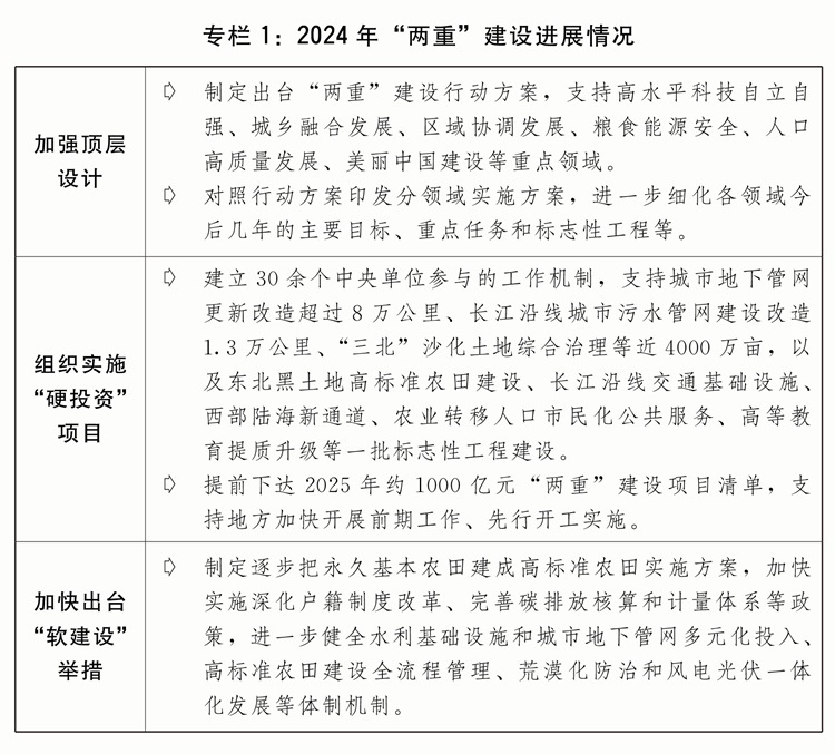二是發(fā)行超長(zhǎng)期特別國(guó)債支持“兩重”建設(shè)取得積極進(jìn)展。著眼于系統(tǒng)解決強(qiáng)國(guó)建設(shè)、民族復(fù)興進(jìn)程中一些重大項(xiàng)目建設(shè)的資金問題,從2024年起發(fā)行超長(zhǎng)期特別國(guó)債支持國(guó)家重大戰(zhàn)略和重點(diǎn)領(lǐng)域安全能力建設(shè)。堅(jiān)持自上而下、軟硬結(jié)合,建立實(shí)施項(xiàng)目?jī)?chǔ)備、集中聯(lián)審、??顚S?、強(qiáng)化監(jiān)督等全鏈條推進(jìn)保障機(jī)制?!坝餐顿Y”方面,嚴(yán)格做好項(xiàng)目篩選,2024年安排7000億元超長(zhǎng)期特別國(guó)債支持1465個(gè)重大項(xiàng)目建設(shè),項(xiàng)目基本全部開工、全年完成投資超過1.2萬億元?!败浗ㄔO(shè)”方面,堅(jiān)持項(xiàng)目建設(shè)和配套改革相結(jié)合,扎實(shí)推進(jìn)規(guī)劃編制、政策制定和體制機(jī)制改革創(chuàng)新,不斷完善投入機(jī)制、提高投入效率。規(guī)范項(xiàng)目全過程管理方面,出臺(tái)“兩重”建設(shè)有關(guān)管理辦法,督促項(xiàng)目加快開工建設(shè),嚴(yán)格資金監(jiān)管,加強(qiáng)監(jiān)測(cè)調(diào)度和現(xiàn)場(chǎng)監(jiān)督檢查,確保建成優(yōu)質(zhì)工程、精品工程、放心工程。