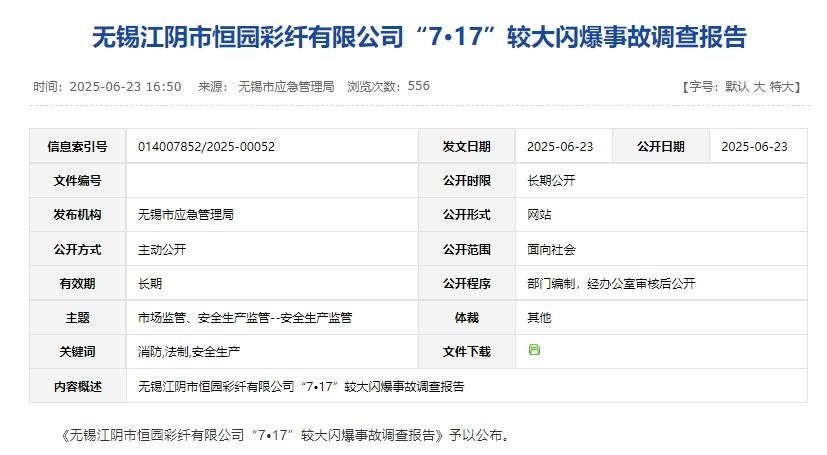 調(diào)查認定,無錫江陰市恒園彩纖有限公司“7·17”較大閃爆事故是一起因崗位員工盲目操作,生產(chǎn)單元安全設(shè)施缺失,現(xiàn)場應(yīng)急處置不當(dāng),地方黨委、政府及其有關(guān)部門履職不到位而導(dǎo)致的較大生產(chǎn)安全責(zé)任事故。