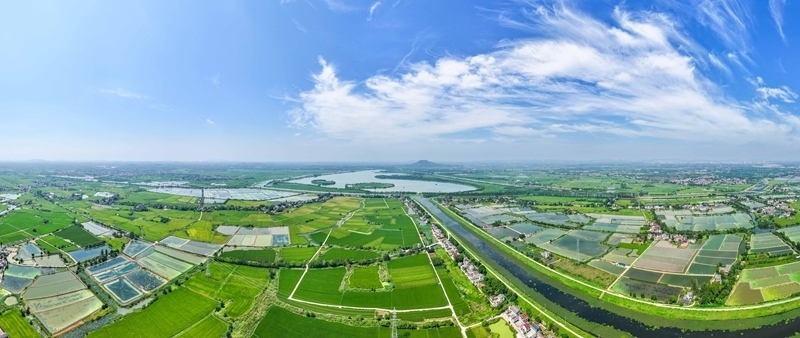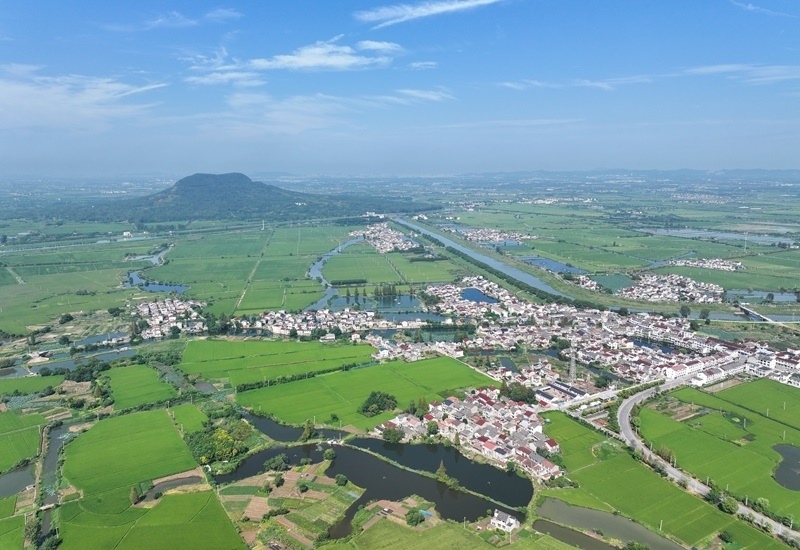 9月15日拍攝的句容赤山湖及周邊農(nóng)田(無人機全景照片)。