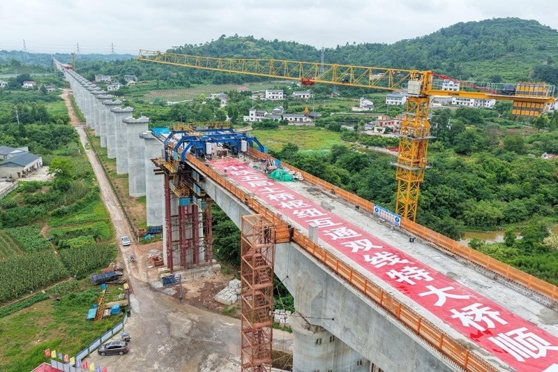 當日,由中鐵五局承建的成渝中線高鐵土橋樞紐互通雙線特大橋連續(xù)梁順利合龍,該連續(xù)梁全長約242米,是成渝中線高鐵重慶段跨度最大的連續(xù)梁。土橋樞紐互通雙線特大橋位于重慶市銅梁區(qū),全長3271.6米,上跨重慶三環(huán)高速及銅安高速公路,共設(shè)有92個橋墩,2個橋臺。