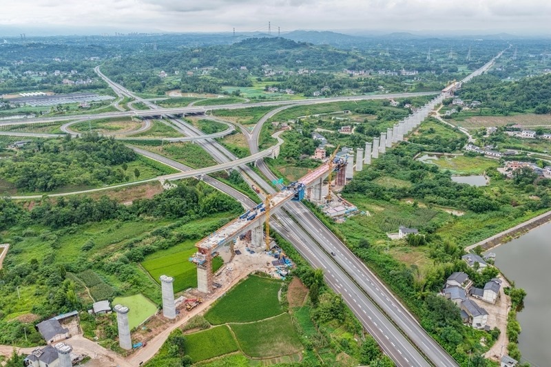 這是7月8日拍攝的成渝中線高鐵土橋樞紐互通雙線特大橋建設(shè)現(xiàn)場(無人機照片)。
