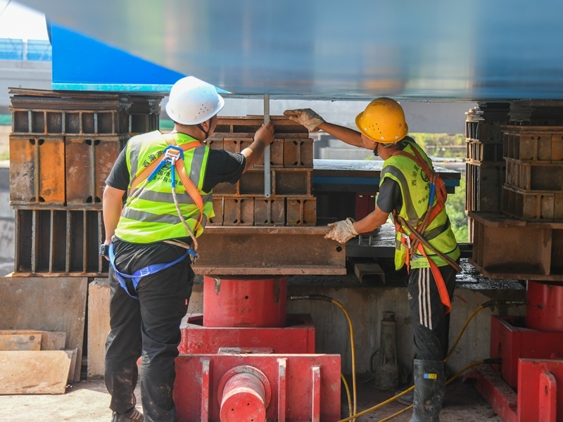 7月11日,工人在西渝高鐵跨營達(dá)高速公路大橋進(jìn)行頂推施工作業(yè)。