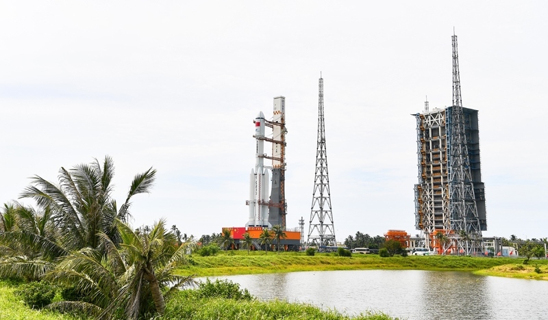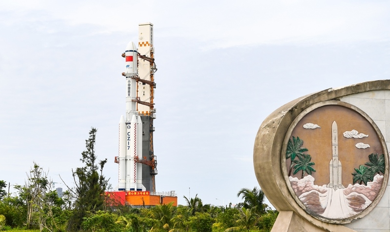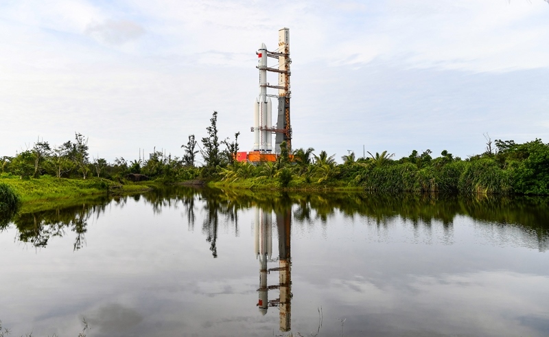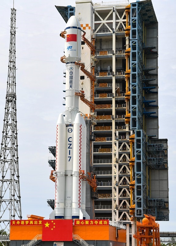 7月12日,天舟九號貨運飛船與長征七號遙十運載火箭組合體垂直轉(zhuǎn)運中。