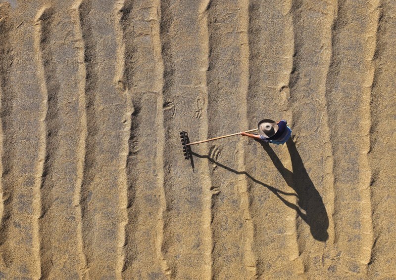 7月15日,在湖南省衡陽(yáng)市衡山縣福田鋪鄉(xiāng),村民在翻曬稻谷(無(wú)人機(jī)照片)。