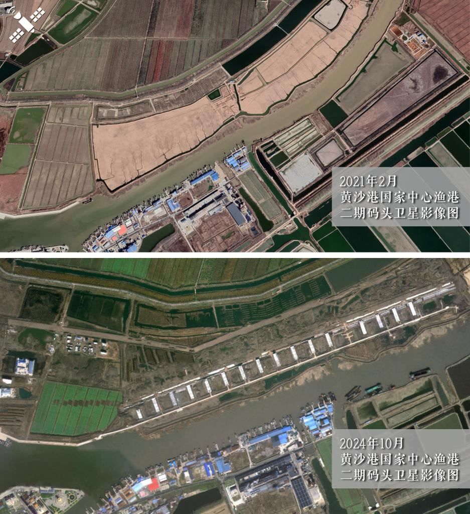 解讀:2021年2月施工初期(上圖)對(duì)比2024年10月(下圖),黃沙港國(guó)家中心漁港二期工程碼頭主體已建成。