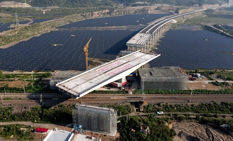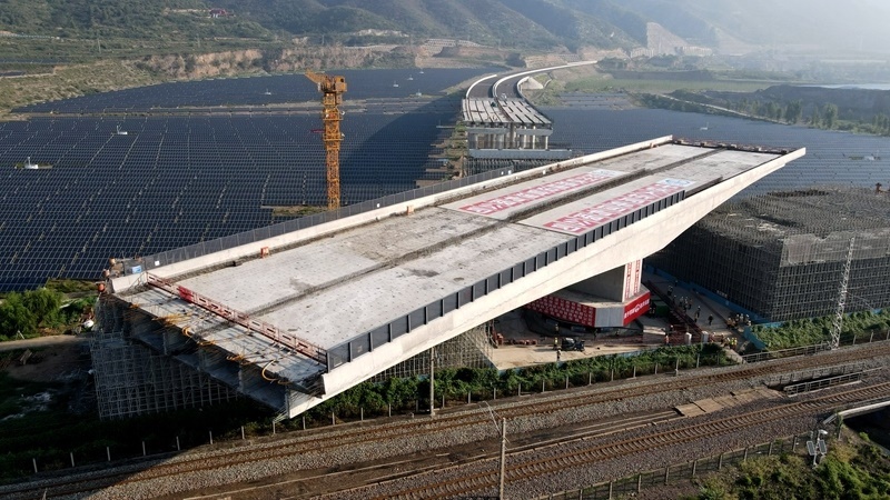 這是8月11日拍攝的河南省濟(jì)源市沿太行山高速公路跨焦柳鐵路立交橋轉(zhuǎn)體施工現(xiàn)場。