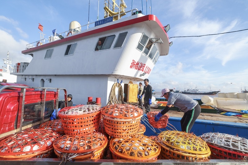 8月12日,開漁歸來的漁運船靠泊在舟山沈家門舟山國際水產城碼頭,漁民把整筐的梭子蟹運送上岸裝車。