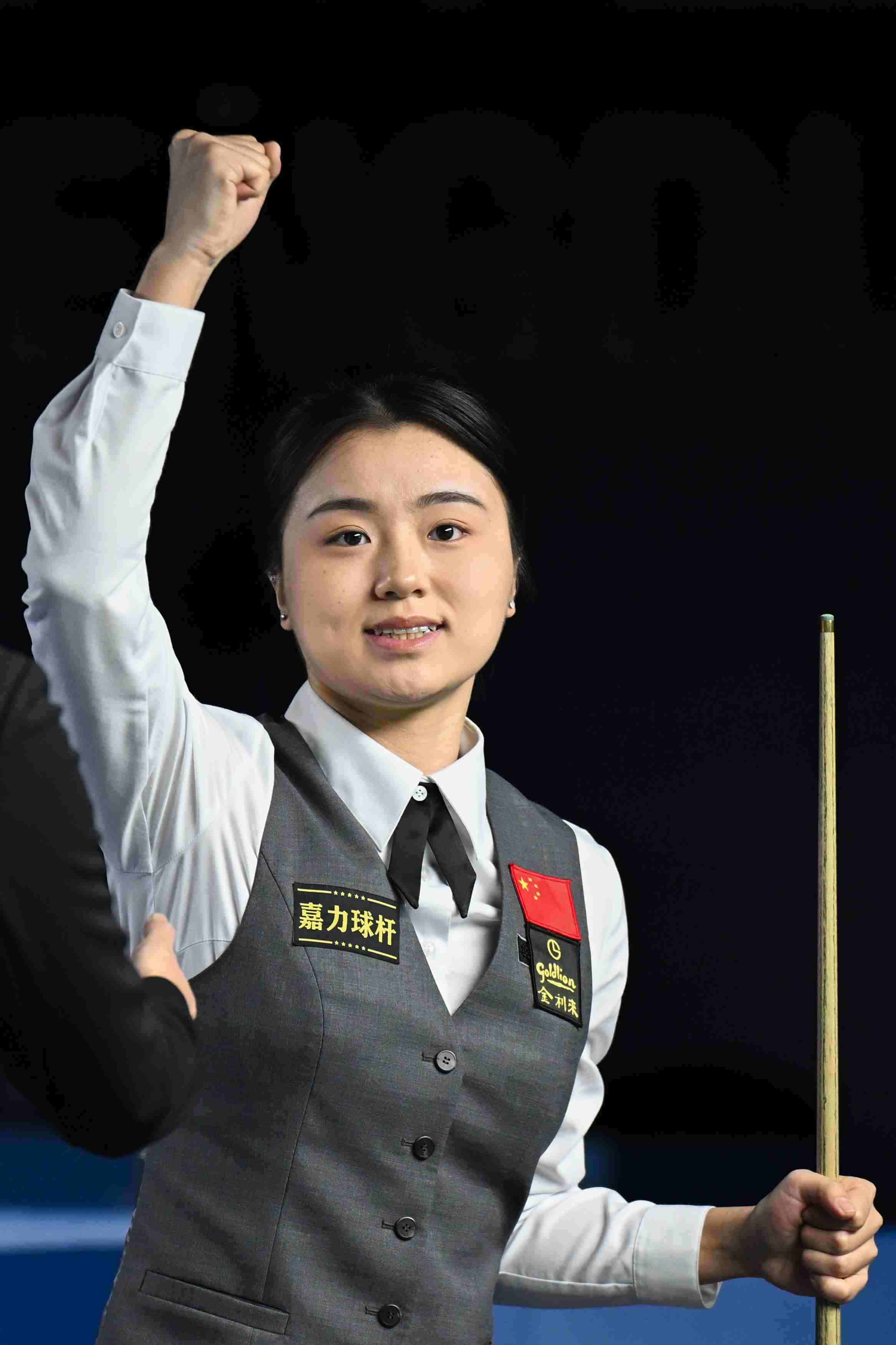由于世運(yùn)會(huì)斯諾克項(xiàng)目采用三局兩勝制,選手們?cè)谶M(jìn)攻選擇上都格外謹(jǐn)慎。決賽首局雙方在攻防兩端幾度糾纏,最終對(duì)手防守出現(xiàn)漏洞,白雨露上手42:18拿下首局。第二局的劇情更為跌宕起伏,白雨露取得10:1領(lǐng)先后貢獻(xiàn)精彩防守,那魯差數(shù)度解球未果,被罰20分。不過白雨露隨后上手后白球掉袋,那魯差一度將分差縮小至10分。此時(shí)臺(tái)面只剩兩顆球,分?jǐn)?shù)仍夠?qū)κ址闯jP(guān)鍵時(shí)刻,白雨露果斷選擇進(jìn)攻遠(yuǎn)臺(tái)粉球,隨著粉球應(yīng)聲落袋,體育館內(nèi)爆發(fā)出熱烈的歡呼。雙方握手之后,白雨露轉(zhuǎn)向觀眾,舉起握拳的右手。
