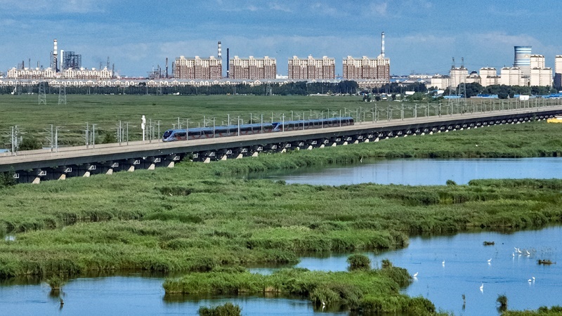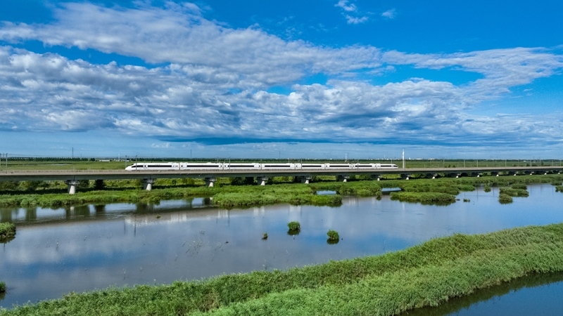 8月17日,復(fù)興號動車組列車行駛在哈齊高鐵線上(無人機照片)。