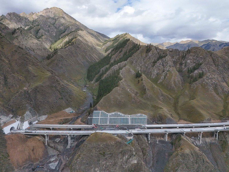 工人在新疆烏尉高速公路躍進3號隧道南端施工(8月19日攝,無人機照片)。