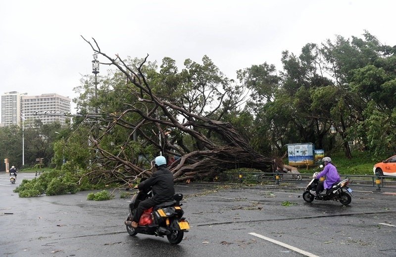 8月25日,在海南省三亞市吉陽區(qū),市民從倒伏的樹木前經過。