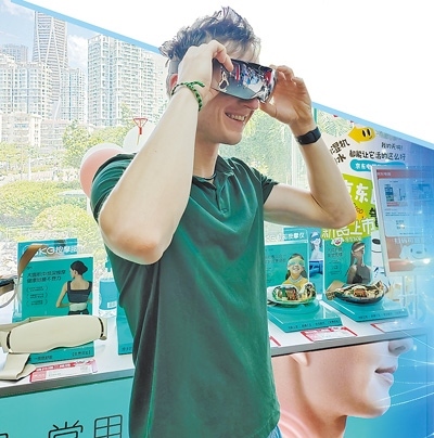 在深圳福田區(qū)華強(qiáng)北群星廣場(chǎng)購(gòu)物中心,來自德國(guó)的小伙子凱試戴電子眼部按摩儀。