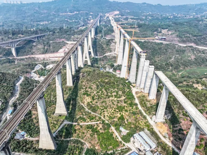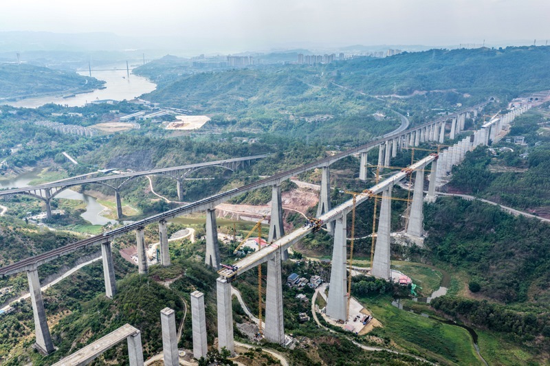 蔡家溝雙線特大橋位于重慶市涪陵區(qū),橫跨長江支流,是全線重難點工程。大橋主跨采用連續(xù)剛構(gòu)設(shè)計,整體呈“兩端短、中間長”的對稱結(jié)構(gòu),總跨度達(dá)584米。