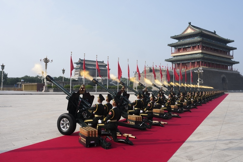 9月3日,紀(jì)念中國(guó)人民抗日戰(zhàn)爭(zhēng)暨世界反法西斯戰(zhàn)爭(zhēng)勝利80周年大會(huì)在北京隆重舉行。這是禮炮在天安門(mén)廣場(chǎng)鳴響。