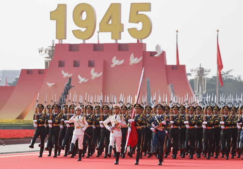 9月3日,紀(jì)念中國(guó)人民抗日戰(zhàn)爭(zhēng)暨世界反法西斯戰(zhàn)爭(zhēng)勝利80周年大會(huì)在北京隆重舉行。這是國(guó)旗護(hù)衛(wèi)隊(duì)在行進(jìn)中。