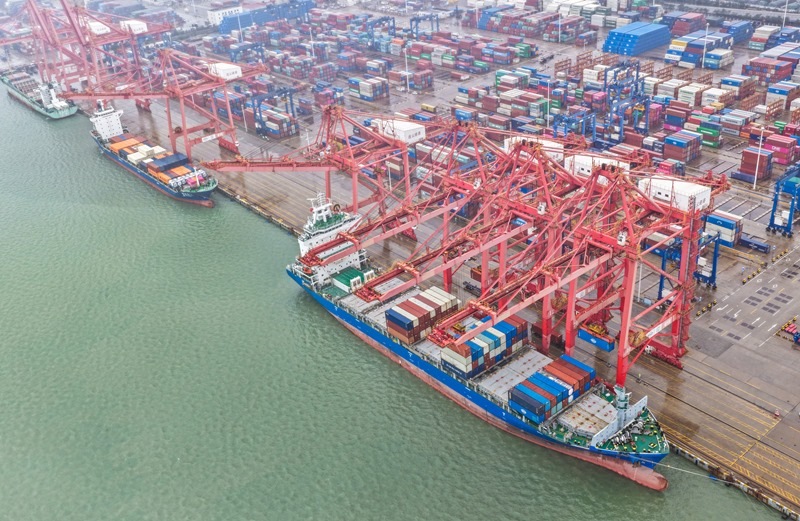 10月13日,在江蘇省連云港港集裝箱碼頭,貨輪在裝載出口貨物(無人機(jī)照片)。