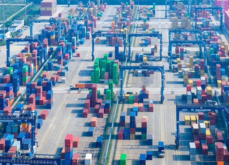 10月13日在山東港口青島港拍攝的外貿(mào)集裝箱碼頭(無人機(jī)照片)。