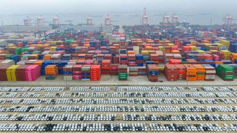 10月13日在江蘇省港口集團(tuán)南京港龍?zhí)陡蹍^(qū)拍攝的準(zhǔn)備裝船出口的汽車(無人機(jī)照片)。