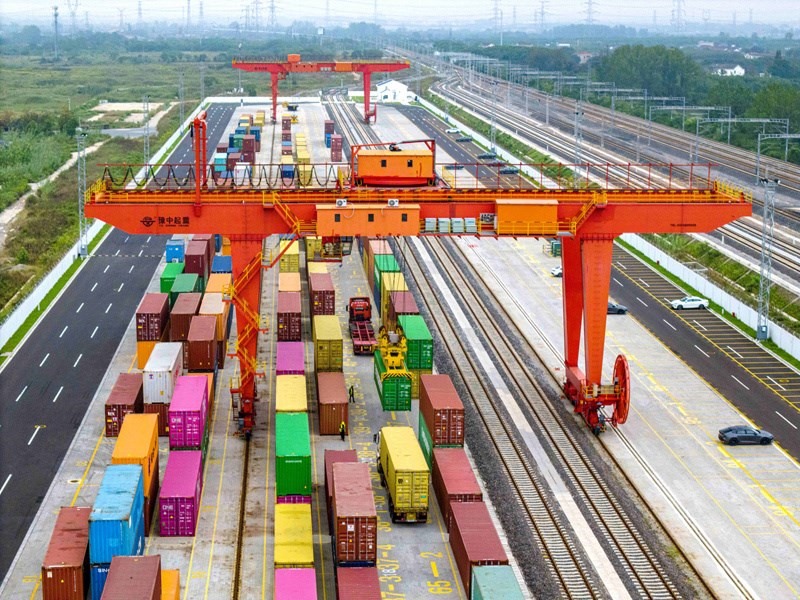 10月13日,在江蘇省揚(yáng)州市江都商貿(mào)物流園鐵路物流基地,大型起重設(shè)備在起吊集裝箱,這些集裝箱將通過海鐵聯(lián)運(yùn)列車發(fā)往上海蘆潮港準(zhǔn)備出口(無人機(jī)照片)。