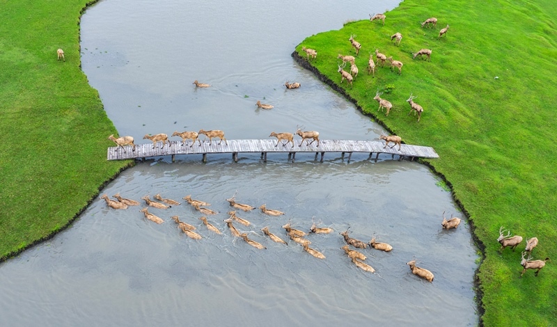 10月17日,在江蘇省泰州市姜堰區(qū)溱湖國家濕地公園,一群麋鹿通過獨木橋(無人機照片)。