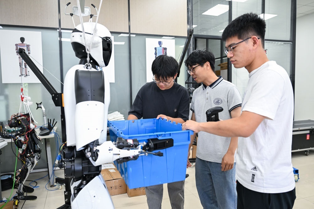2025年5月29日,華中科技大學(xué)機(jī)械科學(xué)與工程學(xué)院,學(xué)生對“荊楚”人形機(jī)器人進(jìn)行搬運(yùn)測試。新華社記者 杜子璇 攝