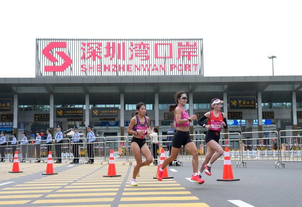 11月15日,第十五屆全國(guó)運(yùn)動(dòng)會(huì)田徑項(xiàng)目女子馬拉松比賽參賽選手經(jīng)過(guò)深圳灣口岸。新華社記者 丁增尼達(dá) 攝