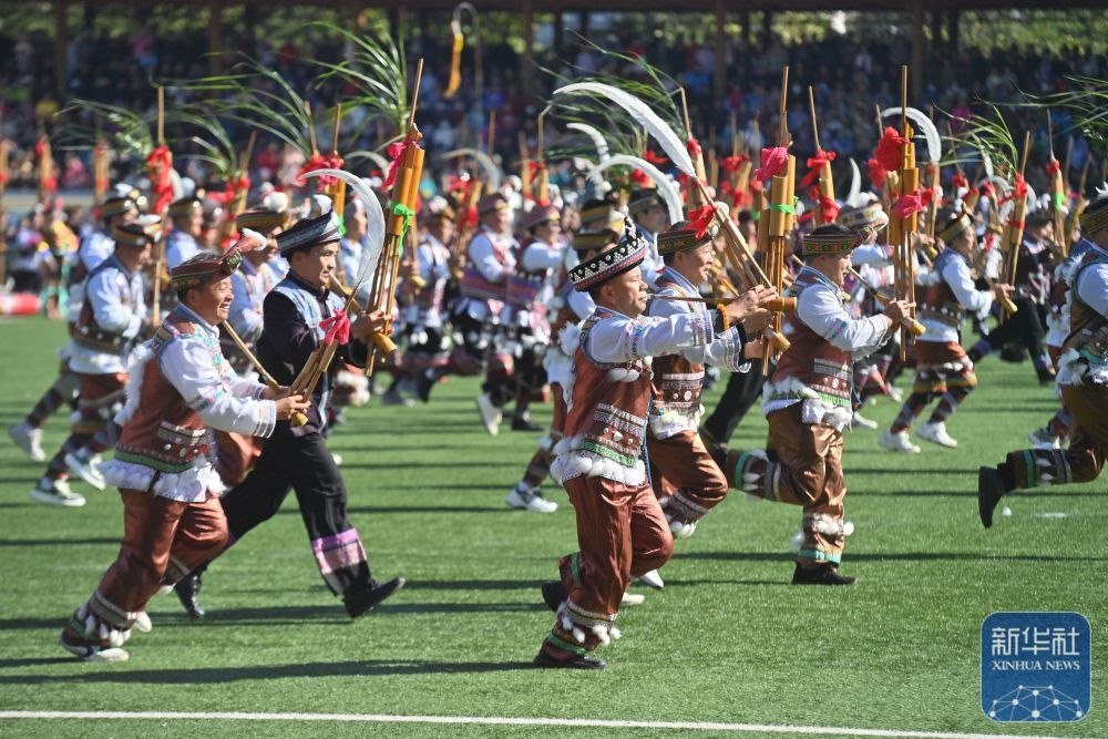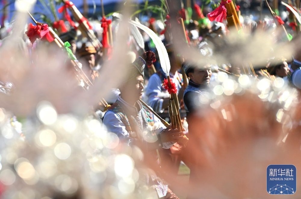 ↑11月29日,表演者在融水縣民族體育公園舉行的蘆笙斗馬節(jié)開幕式現(xiàn)場(chǎng)吹奏蘆笙。新華社記者 黃孝邦 攝