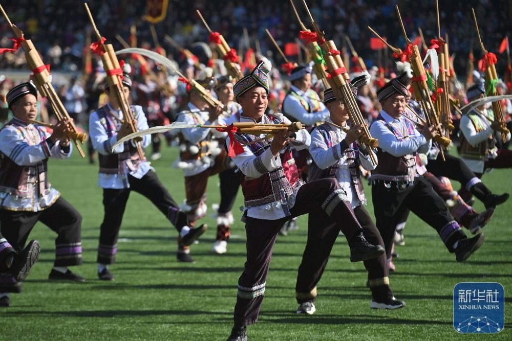 ↑11月29日,表演者在融水縣民族體育公園舉行的蘆笙斗馬節(jié)開幕式現(xiàn)場(chǎng)表演。新華社記者 黃孝邦 攝