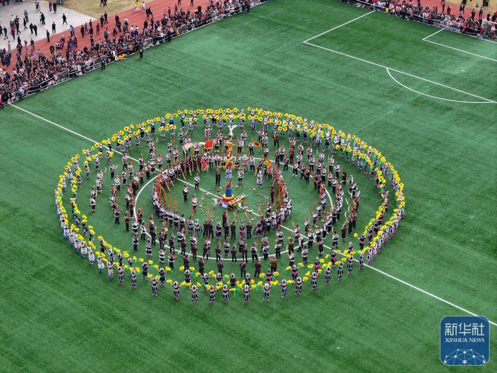 ↑11月29日,表演者在融水縣民族體育公園舉行的蘆笙斗馬節(jié)開幕式現(xiàn)場(chǎng)表演蘆笙踩堂(無(wú)人機(jī)照片)。新華社發(fā)(鄭昌昊攝)