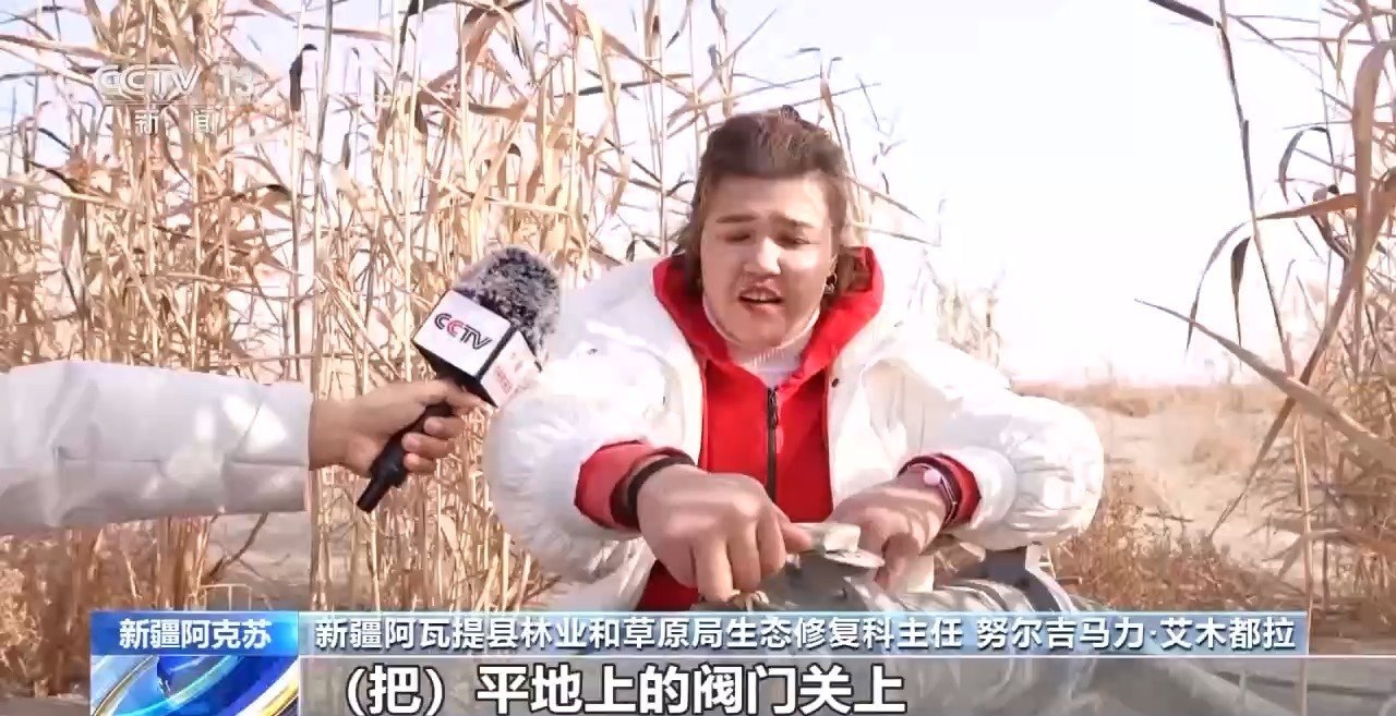 新疆阿瓦提縣林業(yè)和草原局生態(tài)修復(fù)科主任 努爾吉馬力·艾木都拉:把平地上的閥門關(guān)上,然后把全部壓力給到高處沙包上的滴灌管道。再生水來(lái)了,水源充足以后,現(xiàn)在成活率達(dá)到75%以上了。