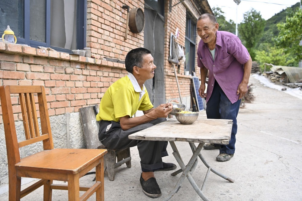 ↑村民元有才(右)為秦海松準備好午餐后,兩人開心交流(2025年8月6日攝)。