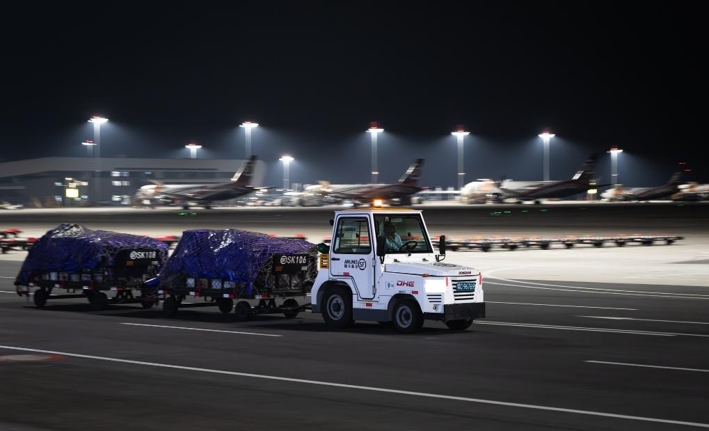 子夜時分,記者驅(qū)車來到這座機場時,撲面而來的是一派“不夜空港”的繁忙景象:雪亮的停機坪上,貨機剛一停穩(wěn),工作人員便操控牽引車、加油車、轉(zhuǎn)運車簇?fù)矶?,卸貨、加油、檢查,井井有條,一刻也不耽誤。