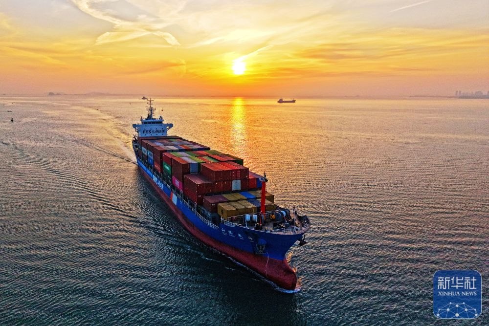 ↑ 12月15日,一艘集裝箱貨輪駛入山東港口煙臺港(無人機照片)。新華社發(fā)(孫文潭攝)