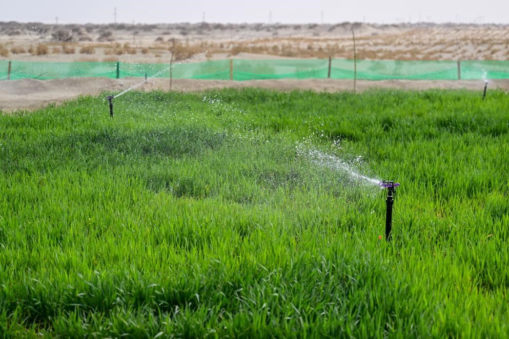 2025年4月13日,新疆阿克蘇地區(qū)沙雅縣沙生經(jīng)濟(jì)作物發(fā)展試驗基地,經(jīng)過苦咸水淡化技術(shù)處理的地下水噴灌出的小麥長勢良好。新華社記者丁磊 攝