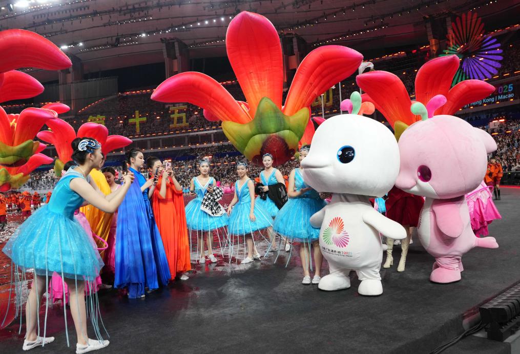 2025年11月9日,演員在第十五屆全國運(yùn)動(dòng)會開幕式后與吉祥物“喜洋洋”和“樂融融”互動(dòng)。新華社記者 吳魯 攝