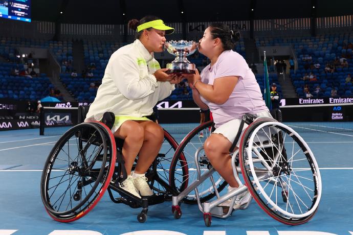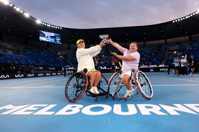 北京時間1月30日,2026澳網(wǎng)輪椅網(wǎng)球女雙決賽,頭號種子、中國組合王紫瑩/李曉輝以6-4、6-3擊敗2號種子朱珍珍/上地結(jié)衣,實現(xiàn)衛(wèi)冕。中國選手朱珍珍和搭檔上地結(jié)衣收獲亞軍。