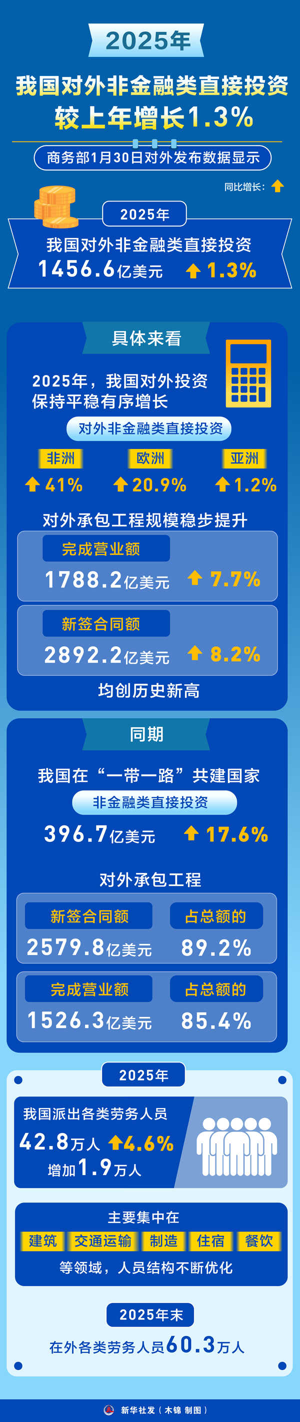 2025年,我國派出各類勞務人員42.8萬人,較上年增長4.6%,增加1.9萬人,主要集中在建筑、交通運輸、制造、住宿和餐飲等領域,人員結構不斷優(yōu)化。2025年末,在外各類勞務人員60.3萬人。