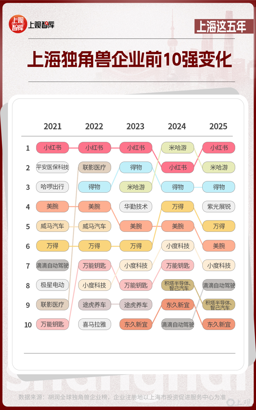 前10位的上海獨角獸企業(yè),從2021年到2025年,發(fā)生了不小的改變。有的企業(yè)已經(jīng)上市,如聯(lián)影醫(yī)療、華勤技術(shù)等;有的企業(yè)悄然退場;有的企業(yè)仍持續(xù)霸榜,如小紅書、米哈游、得物、美腕、萬得。獨角獸企業(yè)的變動與產(chǎn)業(yè)趨勢息息相關(guān)。當新能源汽車產(chǎn)業(yè)進入高質(zhì)量發(fā)展的階段時,智己汽車接過領(lǐng)軍大旗;在AI芯片成為市場熱點時,積塔半導體、紫光展銳已躋身芯片新勢力代表之列。
