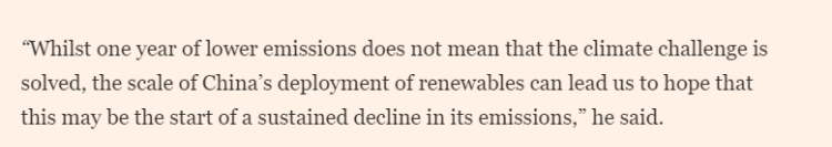 同時,文章稱南安普頓大學(xué)的一位氣候科學(xué)家表示,這些數(shù)據(jù)令人鼓舞,因為它們表明中國對綠色能源的大規(guī)模投資開始轉(zhuǎn)化為可衡量的成果?!半m然一年的減排并不意味著氣候挑戰(zhàn)已經(jīng)解決,但中國在可再生能源方面的大規(guī)模發(fā)展讓我們有理由期待,這或許將是其排放量持續(xù)下降的開端。”